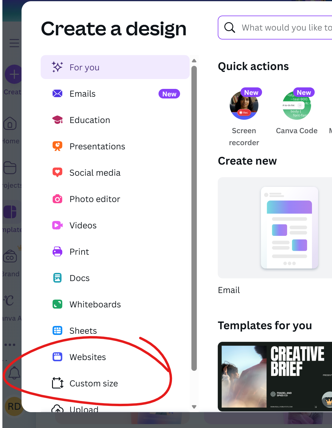 3. On the Create a Design panel, choose Custom Size (near the bottom)